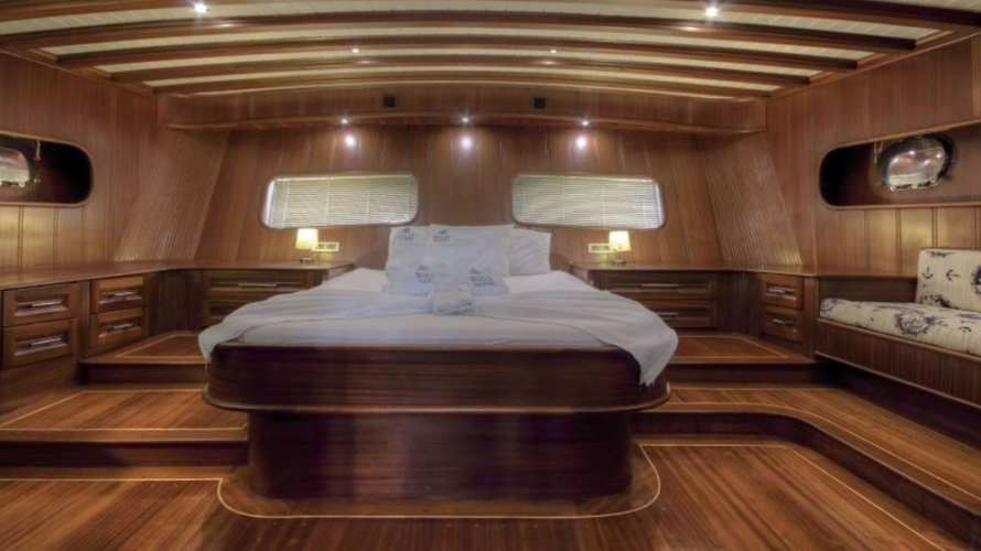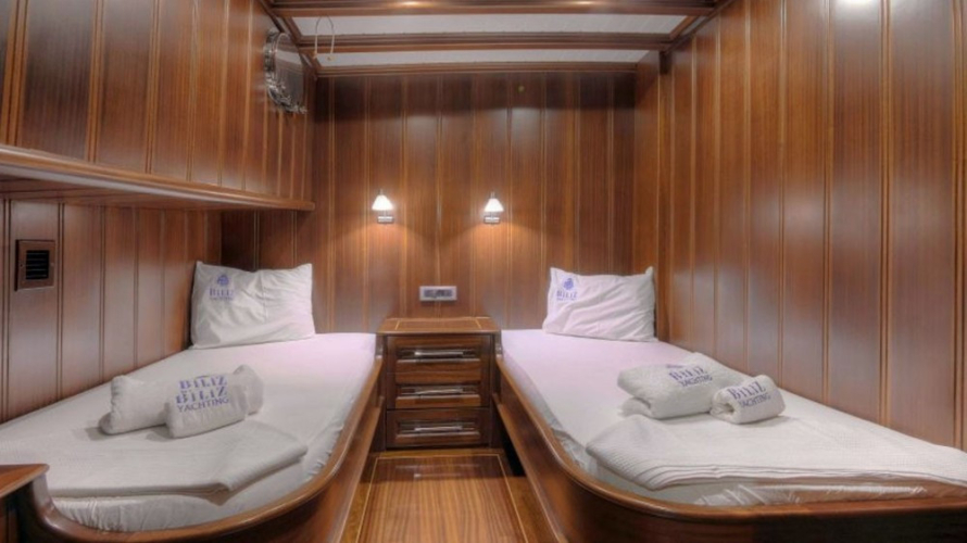 2 master, 1 double ve 1 twin kabin olmak üzere toplam 4 kabinli Biliz Gulet, Türk ve yabancı karasularında 8 yolcuya kadar konaklama imkânı sağlar. Tüm kabinlerde klima, duşakabinli banyo, ev tipi tuvalet, saç kurutma makinesi ile banyo ve el havluları bulunur. Salon bölümünde yemek masası, oturma alanı, LCD TV, DVD oynatıcı ve müzik sistemi mevcuttur. Günlük klima kullanım süresi 8-12 saattir.