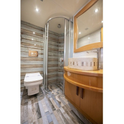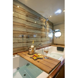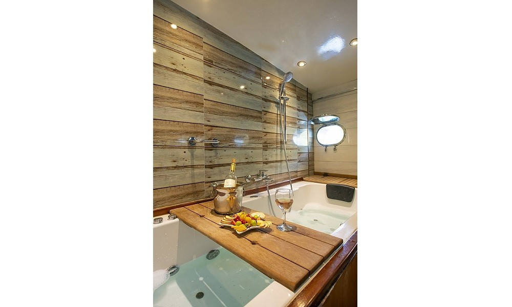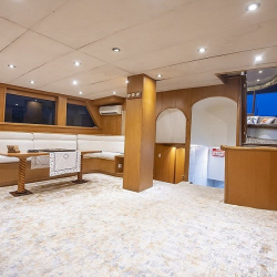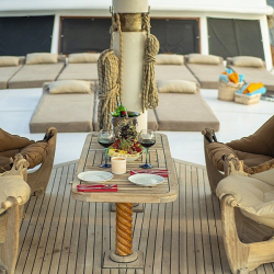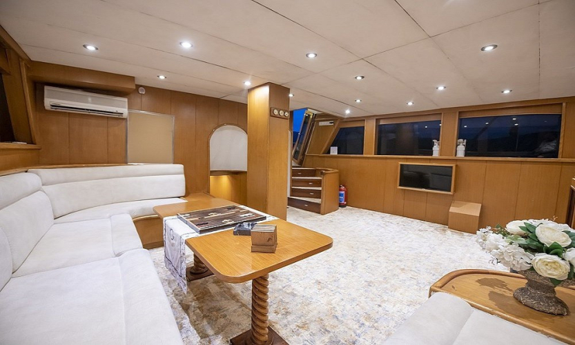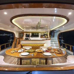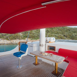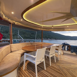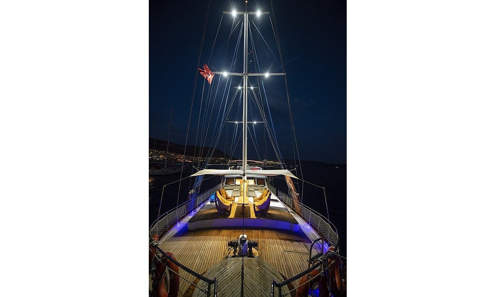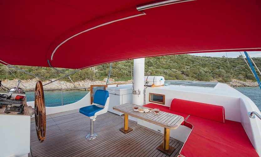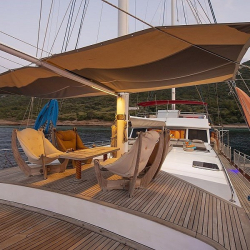 Tik kaplama güvertede arka bölümde yemek masası ve oturma alanı; ön güvertede masa, oturma grubu ve güneşlenme minderleri yer alır. Güverte duşu, deniz merdiveni ve güvenlik filesi de bulunmaktadır.