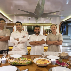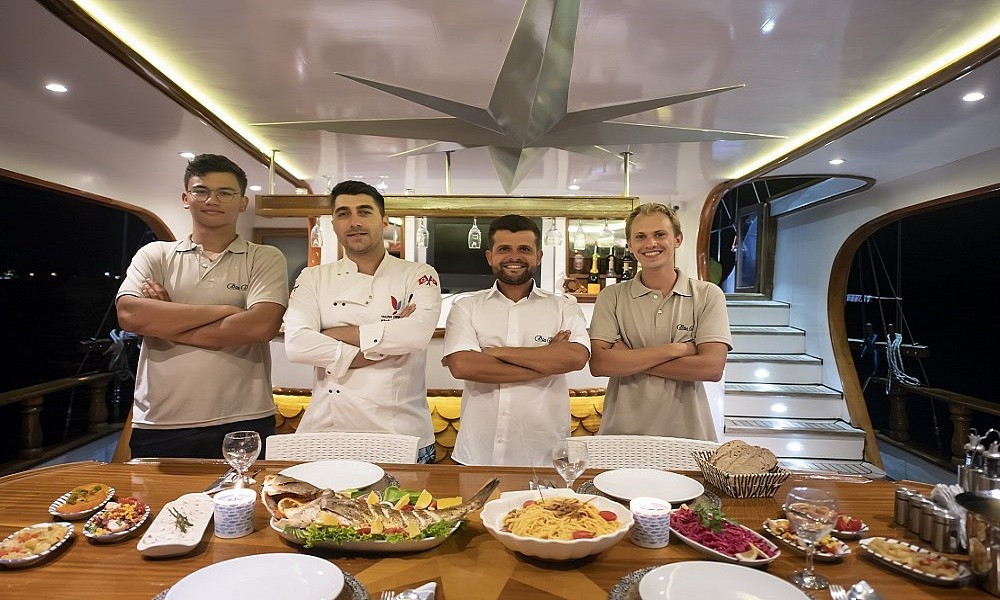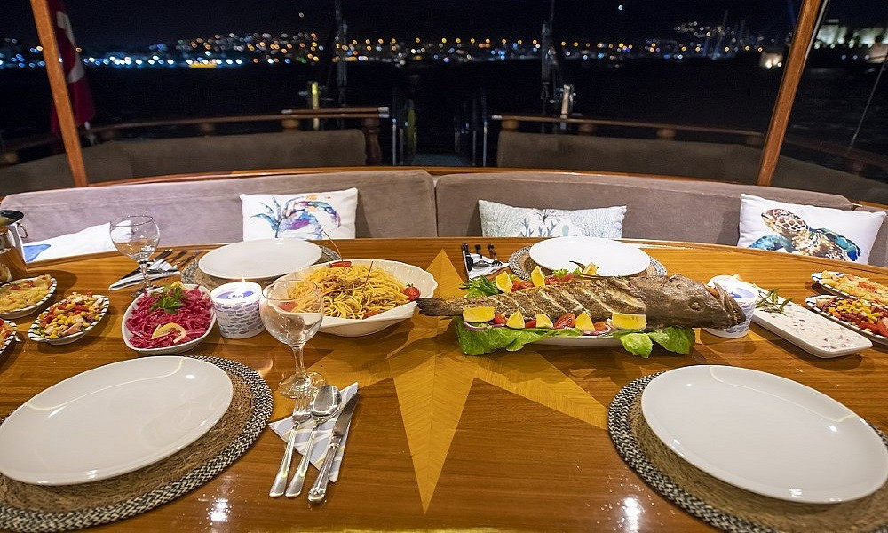 Siz hiç bir şeye karışmadan tatiliniz boyunca size tam pansiyon konaklama sunabiliriz. Bu durumda Standart, Lüks ya da Delüks menülerimizden birini tercih ederek kişi başı günlük 45 ile 65 Euro arasında değişen bir bedel ödeyerek alkollü içecekler hariç herşey dahil tatilinizi yapabilirsiniz. Alkollü içeceklerinizi dilediğiniz şekilde temin edip tekneye getirebilirsiniz.