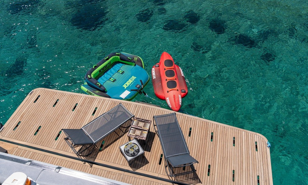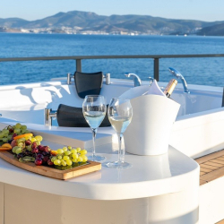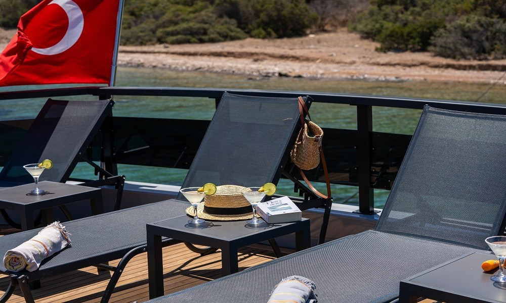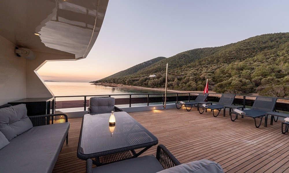 Güverte: Tik kaplı arka güverte ve üst güvertede oturma alanları, yemek masaları, bar, güneşlenme alanları ve jakuzi. Gün batımı manzaralı rahat ortamlar.