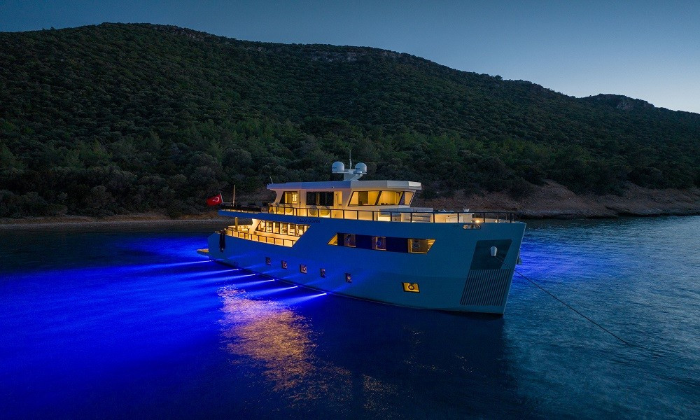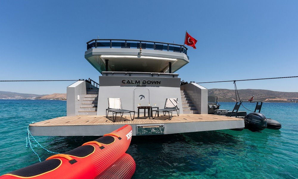 30 metre uzunluğundaki 2023 yapımı Calm Down Trawler, 6 kabininde 12 kişiye kadar konaklama kapasitesi sunarak modern tasarımı ve lüks donanımıyla konforlu bir mavi tur deneyimi yaşatır. Geniş güverte alanları, jakuzi ve zengin aktivite seçenekleriyle özellikle kalabalık aileler ve arkadaş grupları için ideal bir tercihtir.