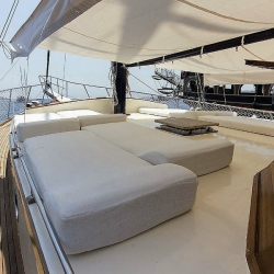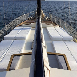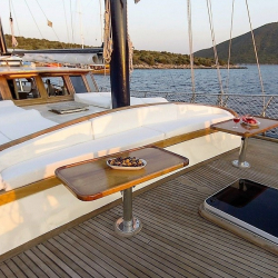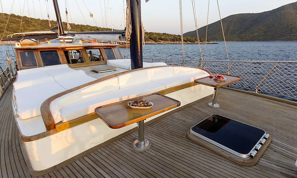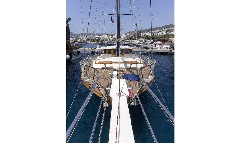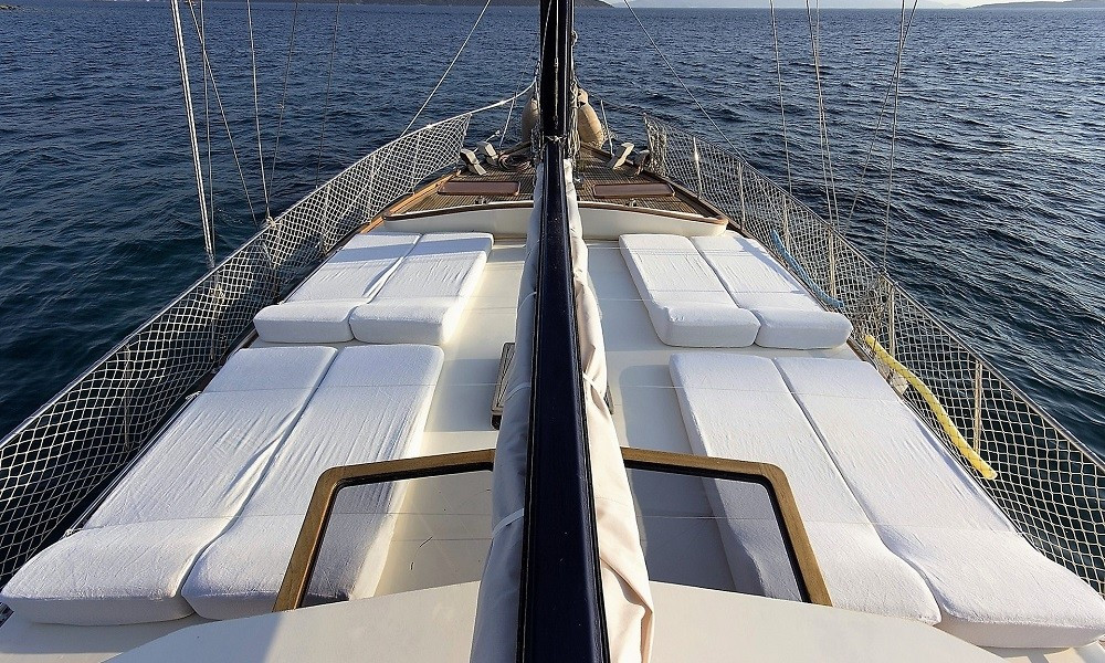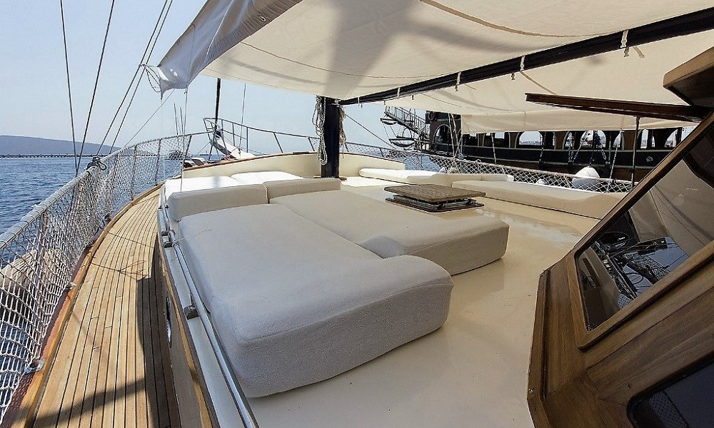Güverte: Tik kaplama zemin, arka güvertede oturma grubu ve yemek masası, ön güvertede güneşlenme alanı ve oturma grubu, deniz merdiveni ve duş.