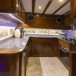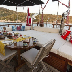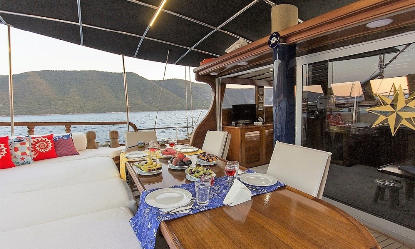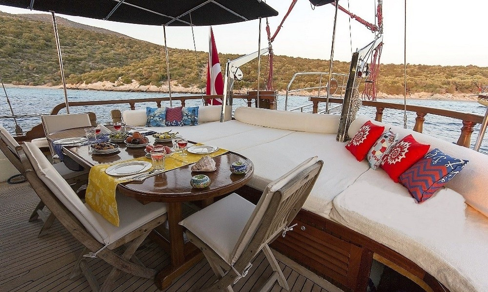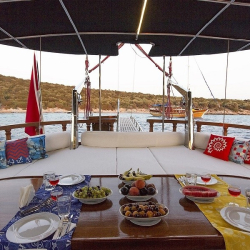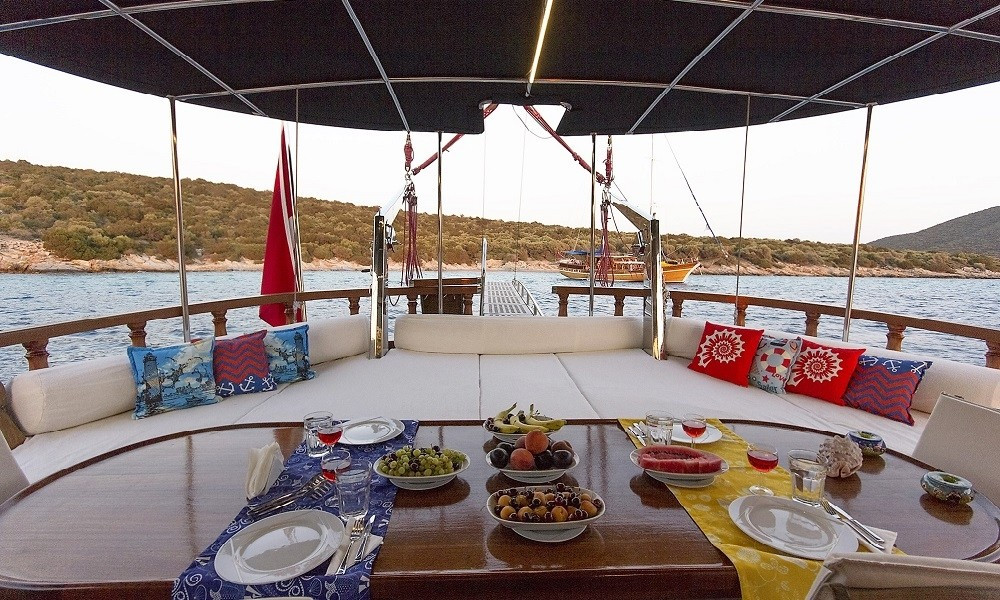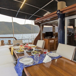 Siz hiç bir şeye karışmadan tatiliniz boyunca size tam pansiyon konaklama sunabiliriz. Bu durumda Standart, Lüks ya da Delüks menülerimizden birini tercih ederek kişi başı günlük 45 ile 65 Euro arasında değişen bir bedel ödeyerek alkollü içecekler hariç herşey dahil tatilinizi yapabilirsiniz. Alkollü içeceklerinizi dilediğiniz şekilde temin edip tekneye getirebilirsiniz.