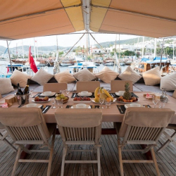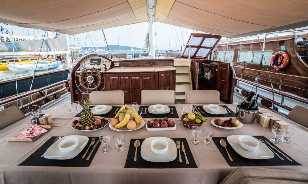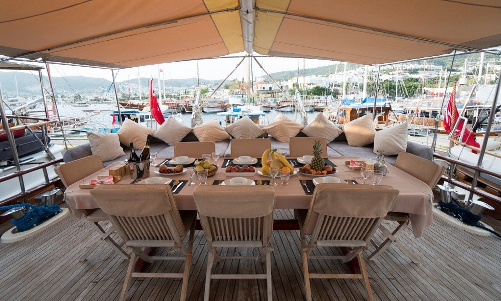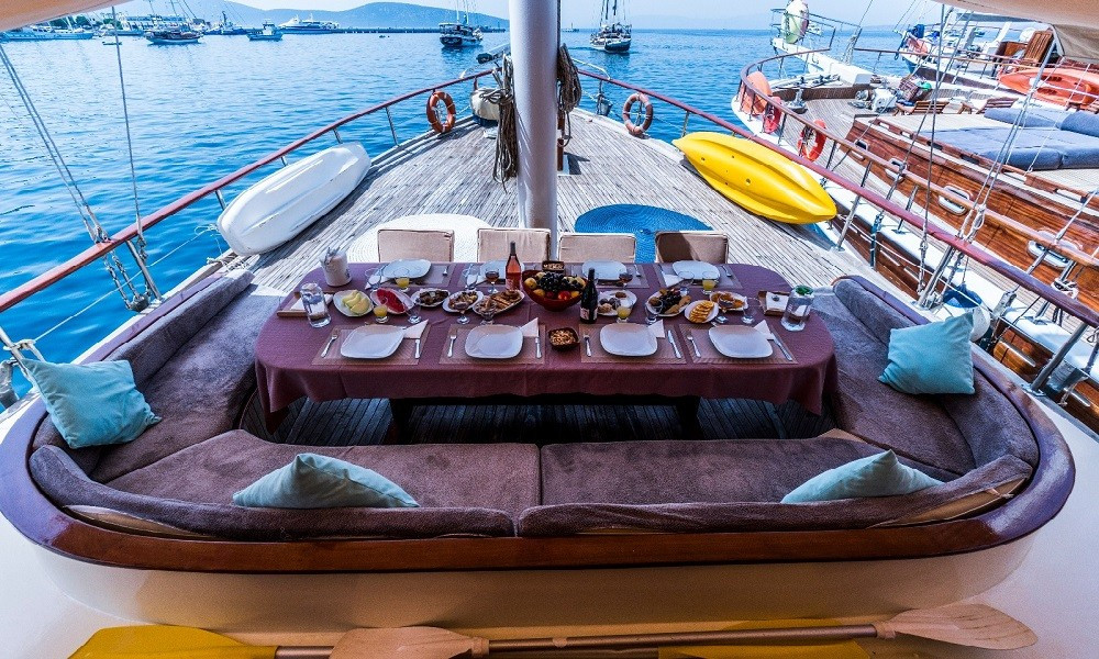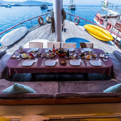 Siz hiç bir şeye karışmadan tatiliniz boyunca size tam pansiyon konaklama sunabiliriz. Bu durumda Standart, Lüks ya da Delüks menülerimizden birini tercih ederek kişi başı günlük 45 ile 65 Euro arasında değişen bir bedel ödeyerek alkollü içecekler hariç herşey dahil tatilinizi yapabilirsiniz. Alkollü içeceklerinizi dilediğiniz şekilde temin edip tekneye getirebilirsiniz.