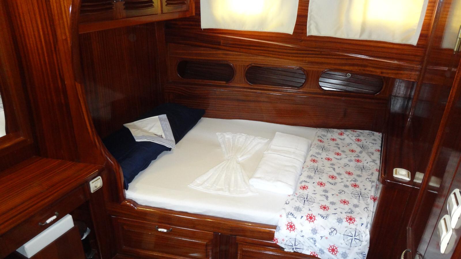 Erkal Gulet 1 Master Kabin, 1 Double Kabin olmak üzere birbirinden şık ve rahat, kendine ait duş, WC ve kliması olan yatımız 2 kamaraya sahiptir.