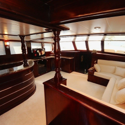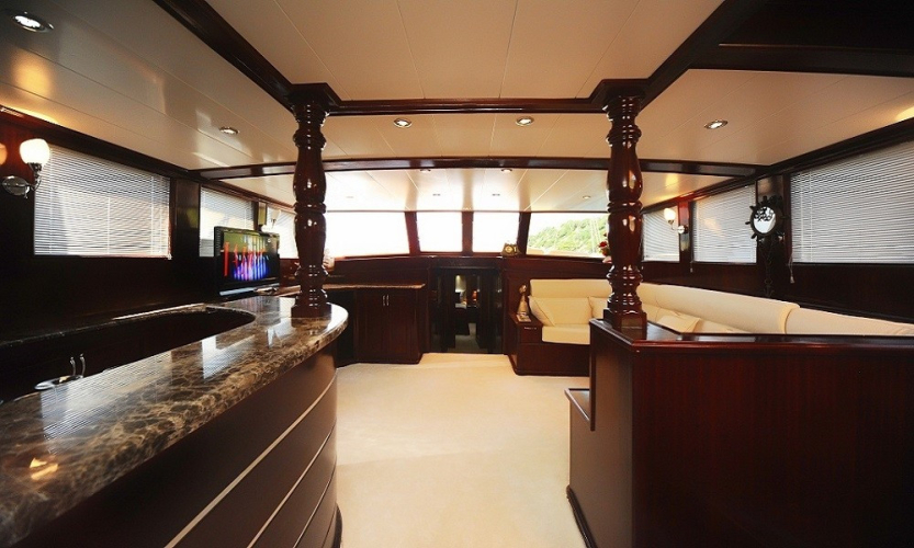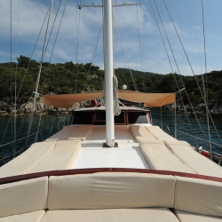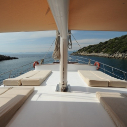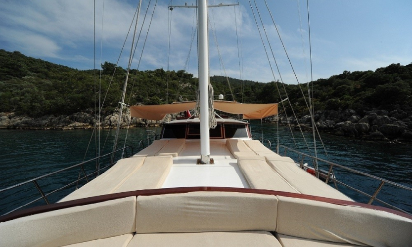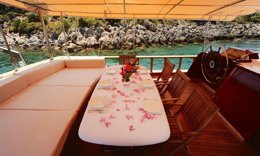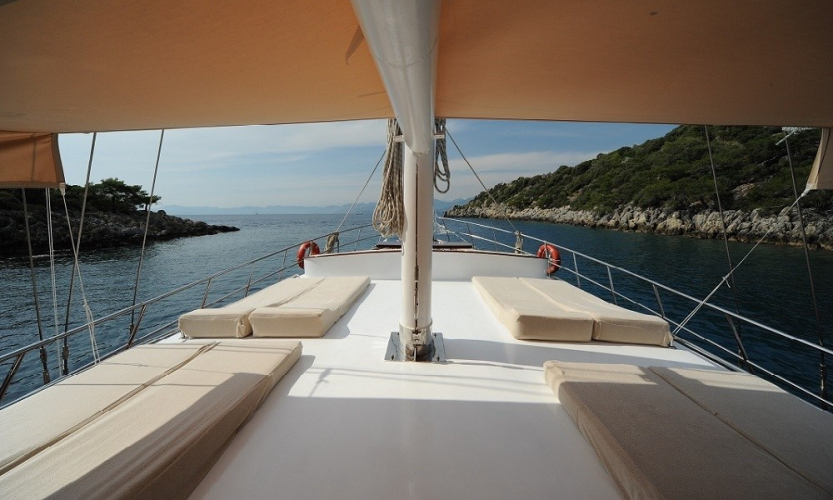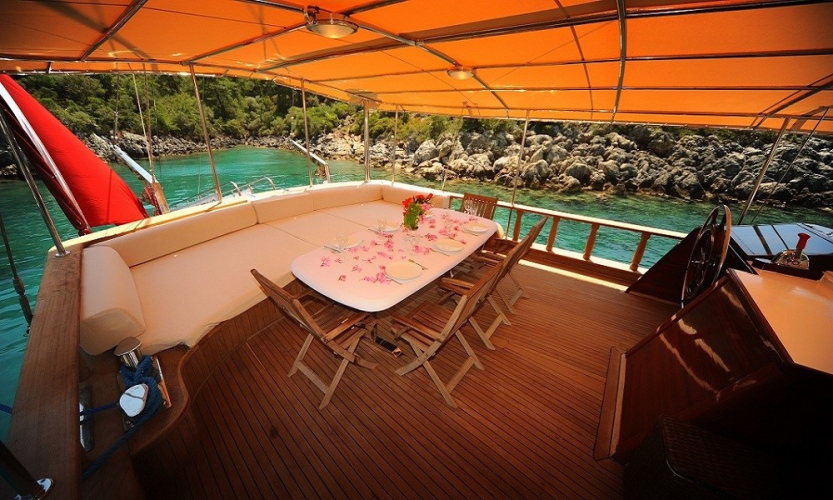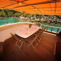 Tik ağacı kaplamalı arka ve ön güvertede oturma alanları, yemek masaları, güneşlenme minderleri, deniz merdiveni ve güverte duşu bulunmaktadır.