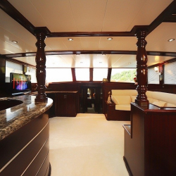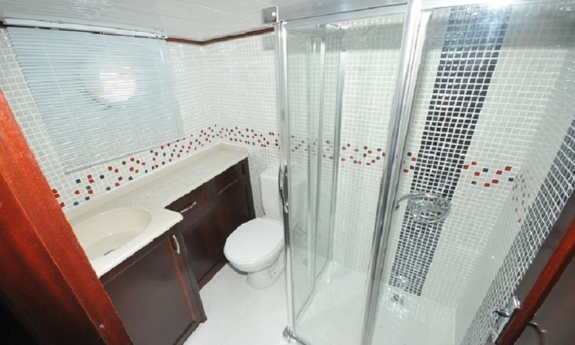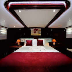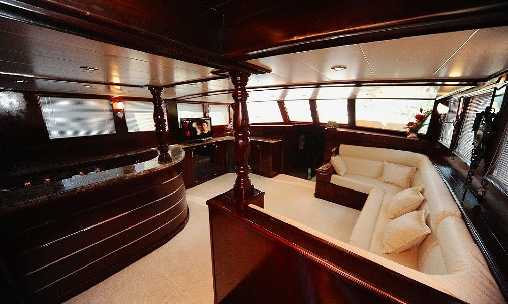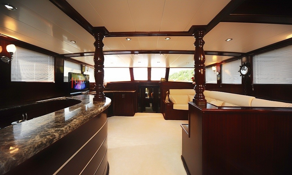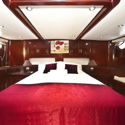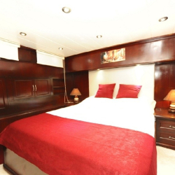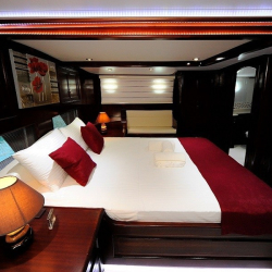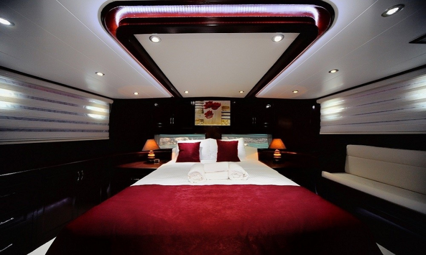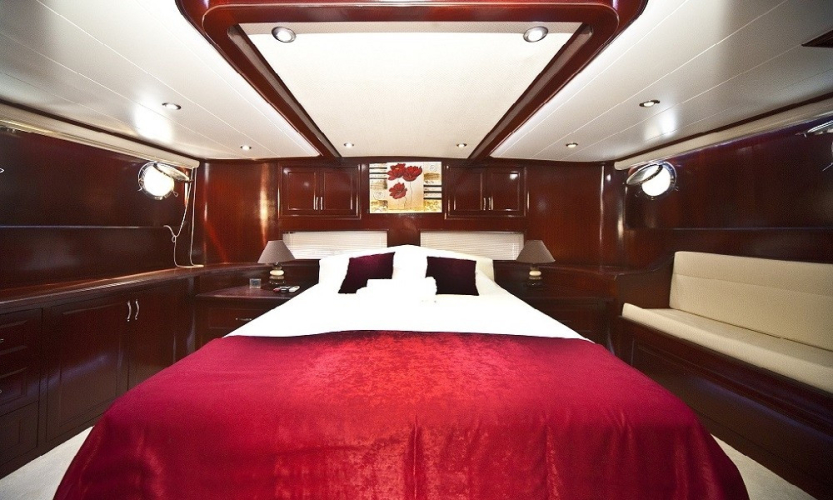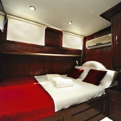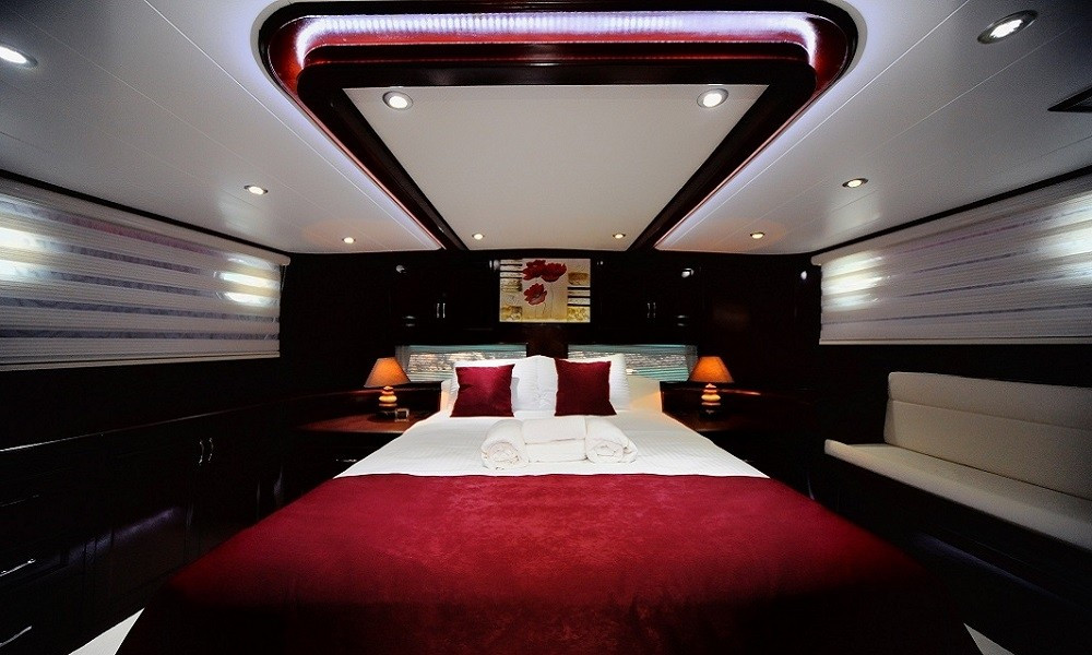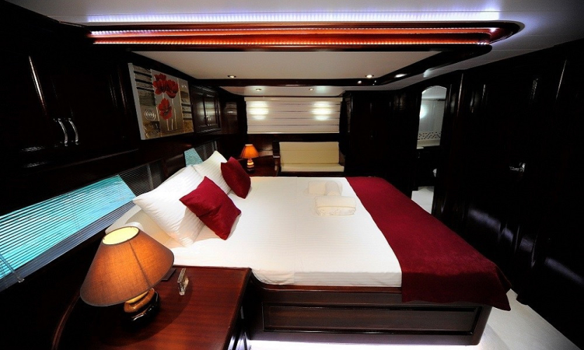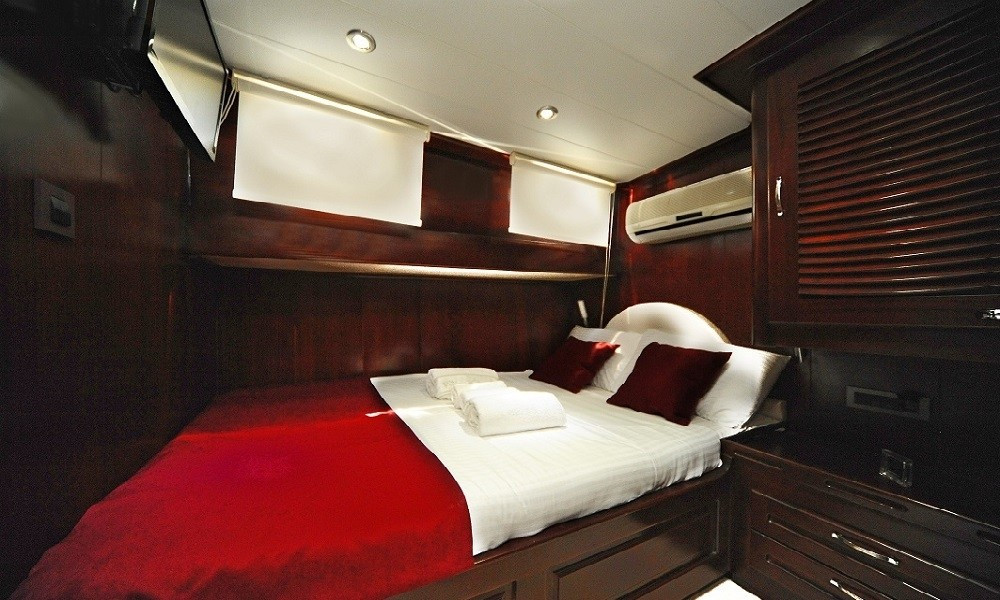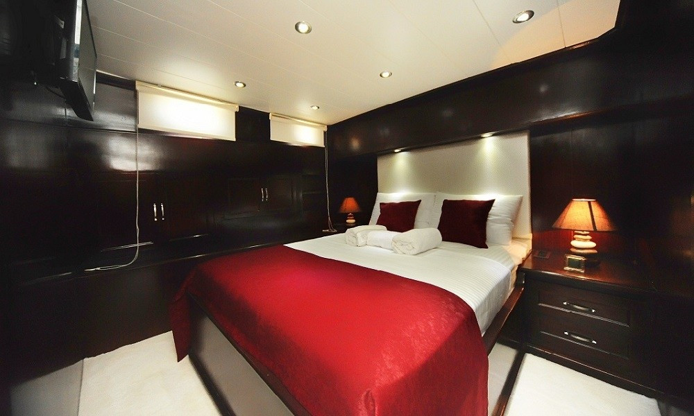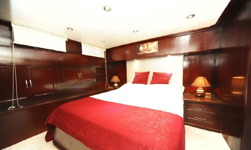 Teknede 2 master ve 2 double olmak üzere toplam 4 kabin bulunur. Her kabin; klima, özel banyo, saç kurutma makinesi ve banyo/elin havluları ile donatılmıştır. Salonda ise yemek masası, oturma grubu, LCD TV, DVD oynatıcı ve müzik sistemi mevcuttur. Klima günlük 6–8 saat arası kullanılabilir.