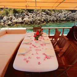 Siz hiç bir şeye karışmadan tatiliniz boyunca size tam pansiyon konaklama sunabiliriz. Bu durumda Standart, Lüks ya da Delüks menülerimizden birini tercih ederek kişi başı günlük 45 ile 65 Euro arasında değişen bir bedel ödeyerek alkollü içecekler hariç herşey dahil tatilinizi yapabilirsiniz. Alkollü içeceklerinizi dilediğiniz şekilde temin edip tekneye getirebilirsiniz.