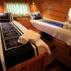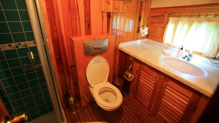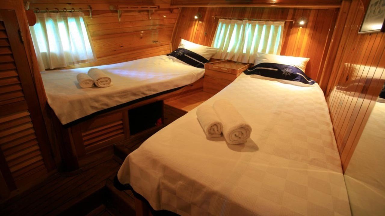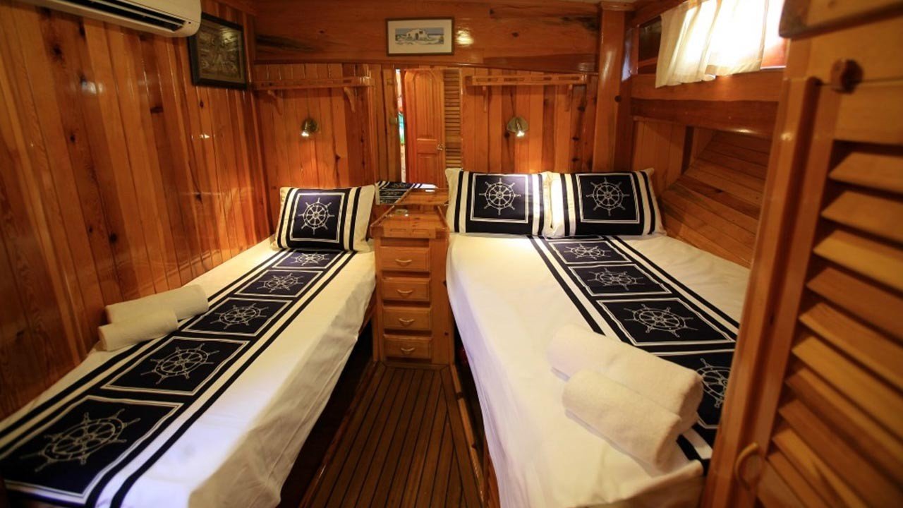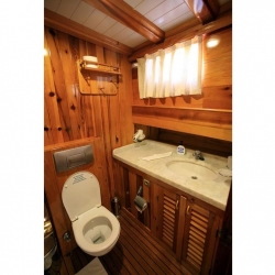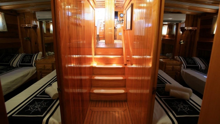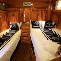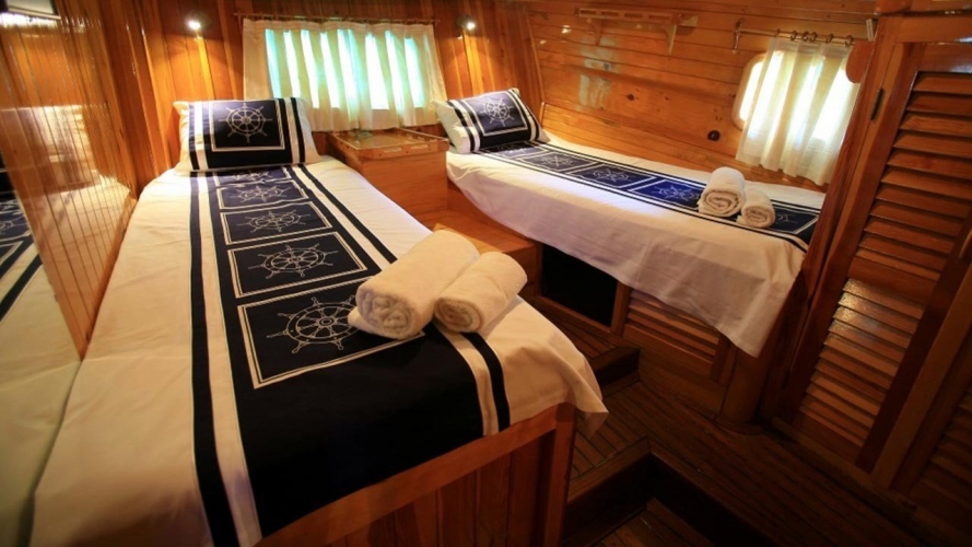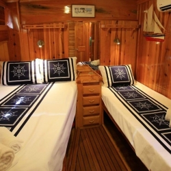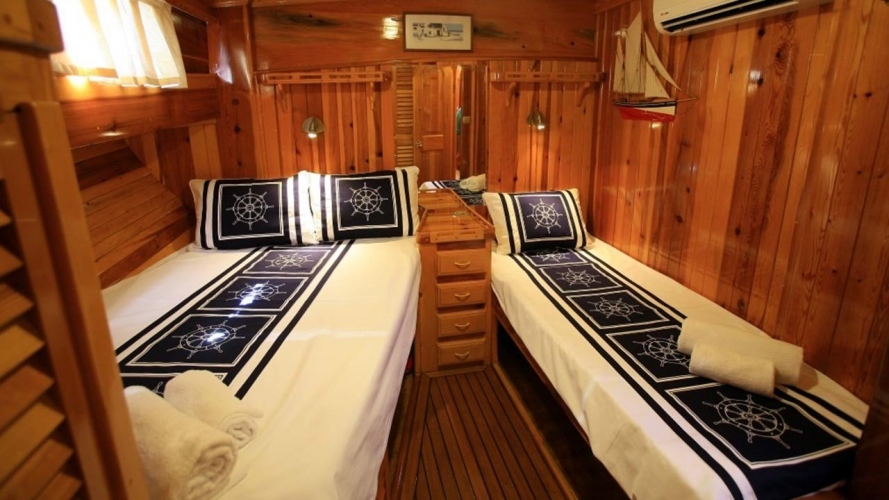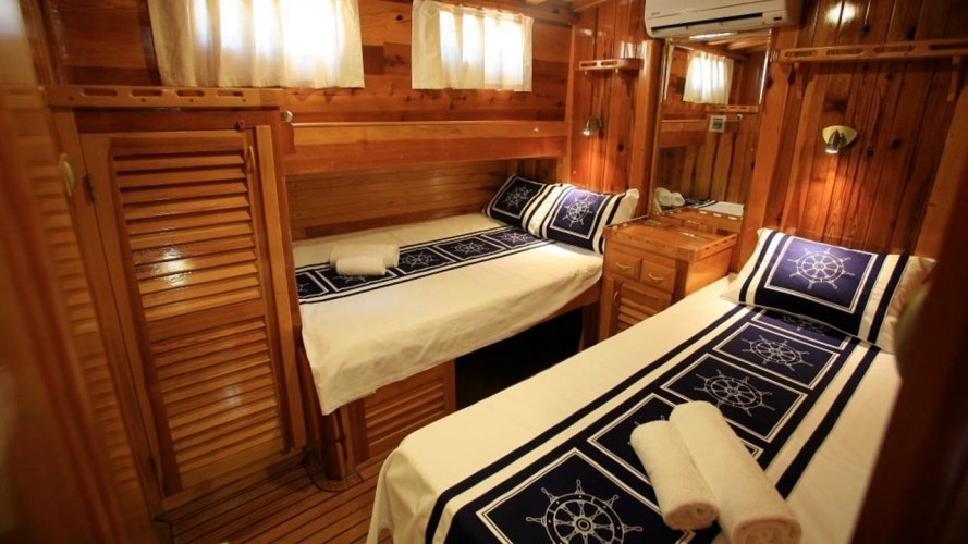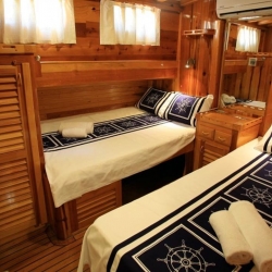 4 Triple Kabin, 2 Twin Kabin olmak üzere birbirinden şık ve rahat, kendine ait duş, WC ve kliması olan yatımız 6 kamaraya sahiptir. Kaya Guneri II guleti 2002 yılında inşa edilmiştir. 30 m boy ve 7 m ene sahip tekne 4 personeli ile siz değerli misafirlerimize mavi tur hizmeti vermektedir. 4 Triple Kabin, 2 Twin Kabin olmak üzere birbirinden şık ve rahat, kendine ait duş, WC ve kliması olan yatımız 6 kamaraya sahiptir.