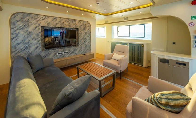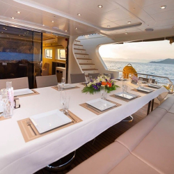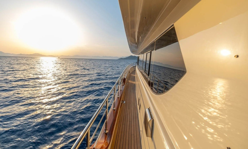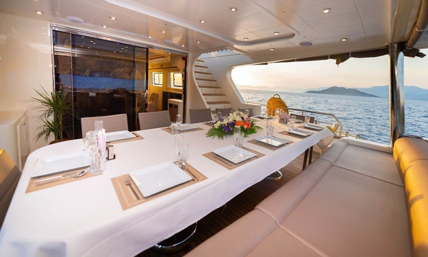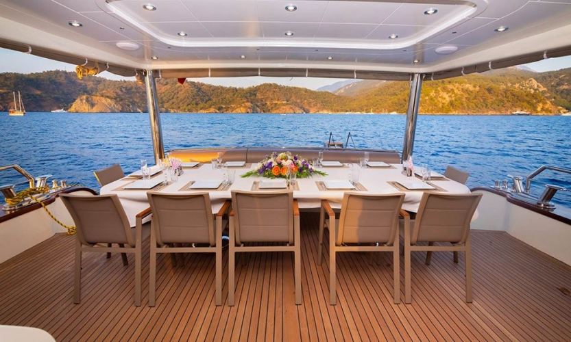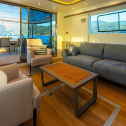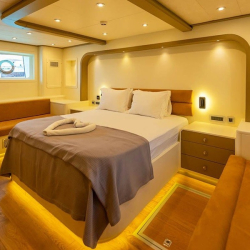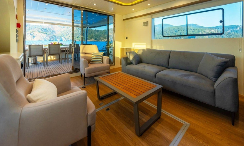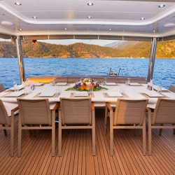 Güverte: Tik kaplı arka güverte ve üst güvertede yemek masaları, oturma alanları, bar, jakuzi, güneşlenme minderleri ve duş. Sosyalleşme ve dinlenme için ideal ortamlar.