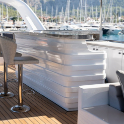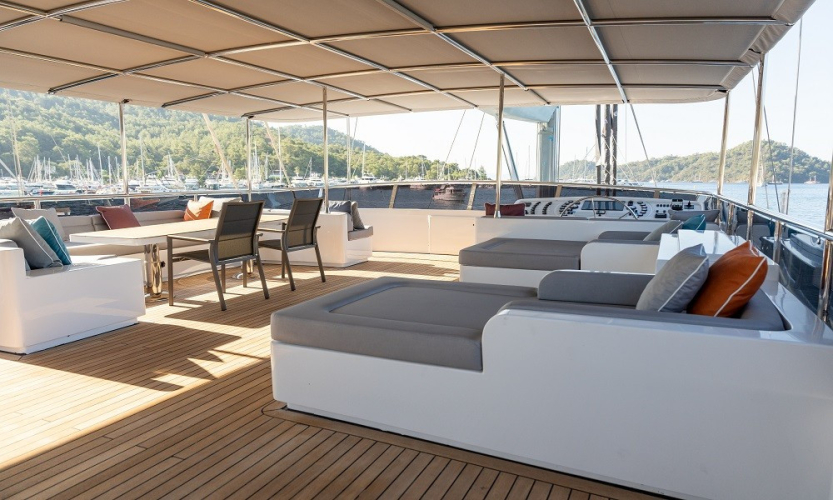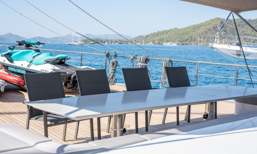Güverte: Tik zemin kaplama, ön ve arka güvertede yemek masaları, oturma alanları, güneşlenme minderleri, deniz merdiveni, güverte duşu.