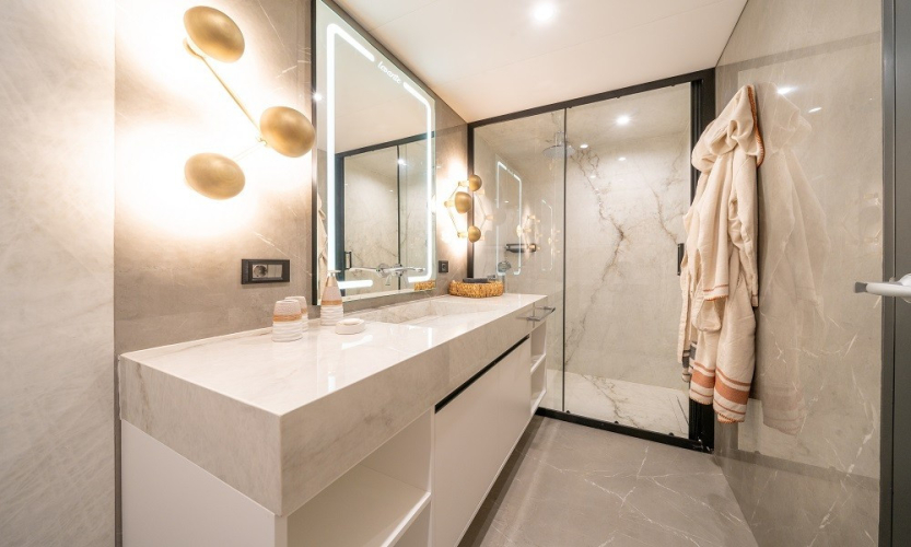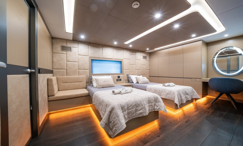 5 Kabin: 1 Master, 3 Double ve 1 Twin kabin. Her kabinde TV, klima, kasa, özel banyo ve WC, saç kurutma makinesi, banyo ve el havluları.