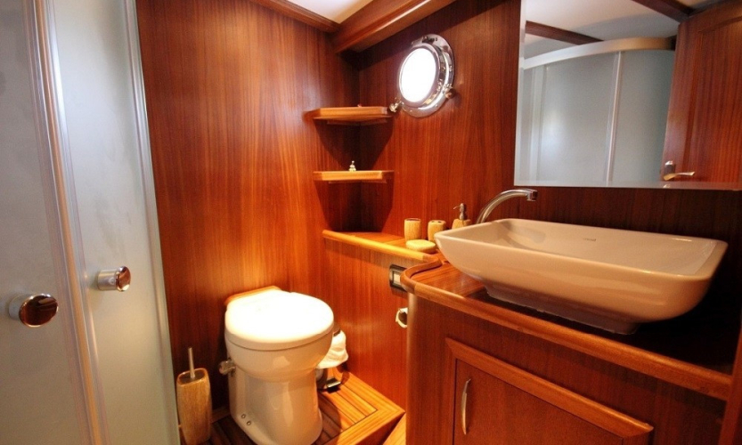3 Kabin: 1 master ve 2 double kabin ile toplamda 6 kişiye kadar konaklama imkânı sunar. Her kabinde duş, ev tipi tuvalet, saç kurutma makinesi, banyo ve el havluları bulunur. Klima günlük 4–6 saat hizmet verir.