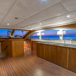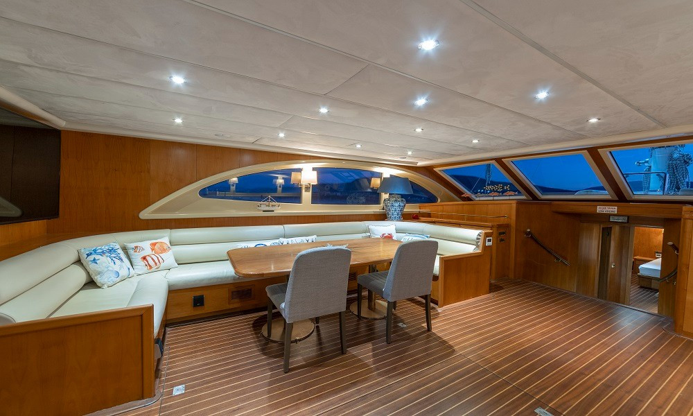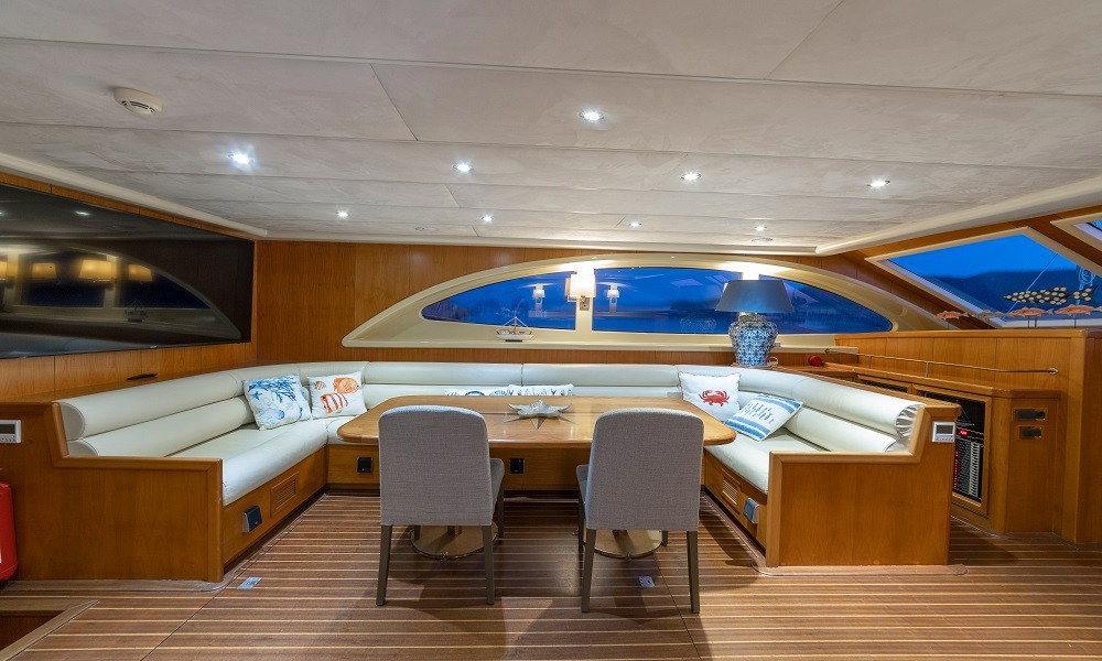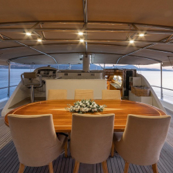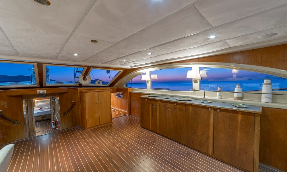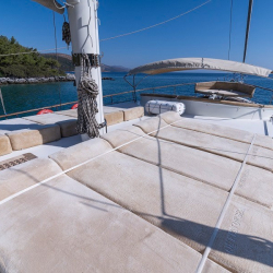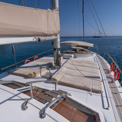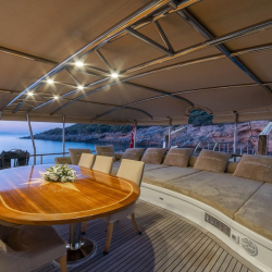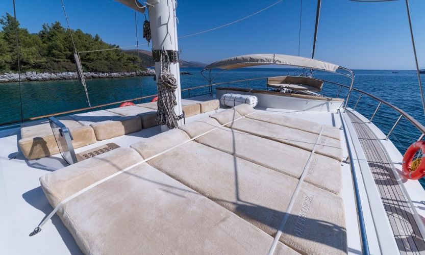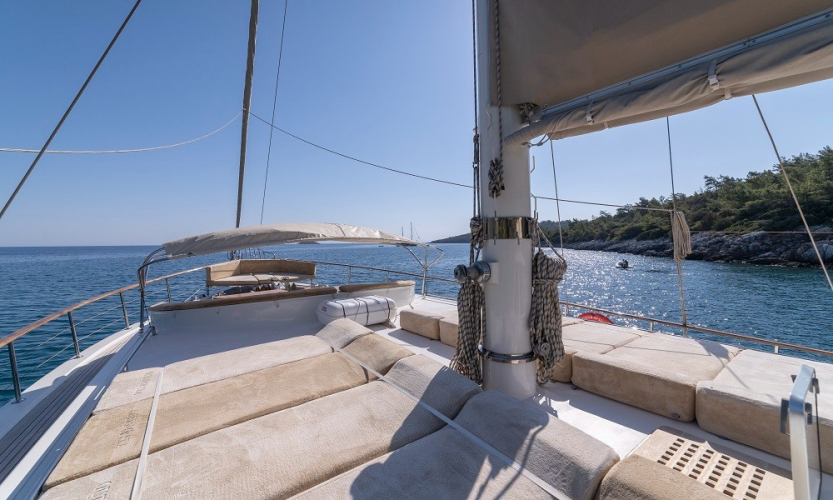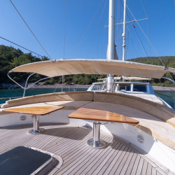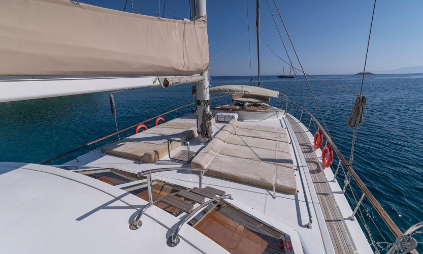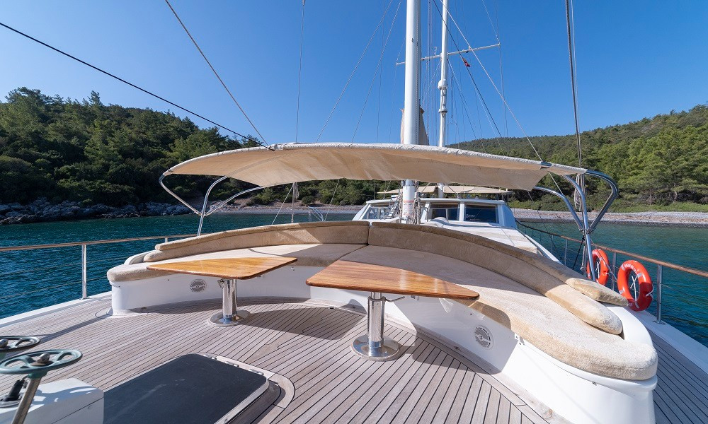 Güverte: Tik kaplama zemin, ön güvertede güneşlenme alanı, arka güvertede oturma grubu ve yemek masası, güverte duşu, deniz merdiveni, müzik sistemi.