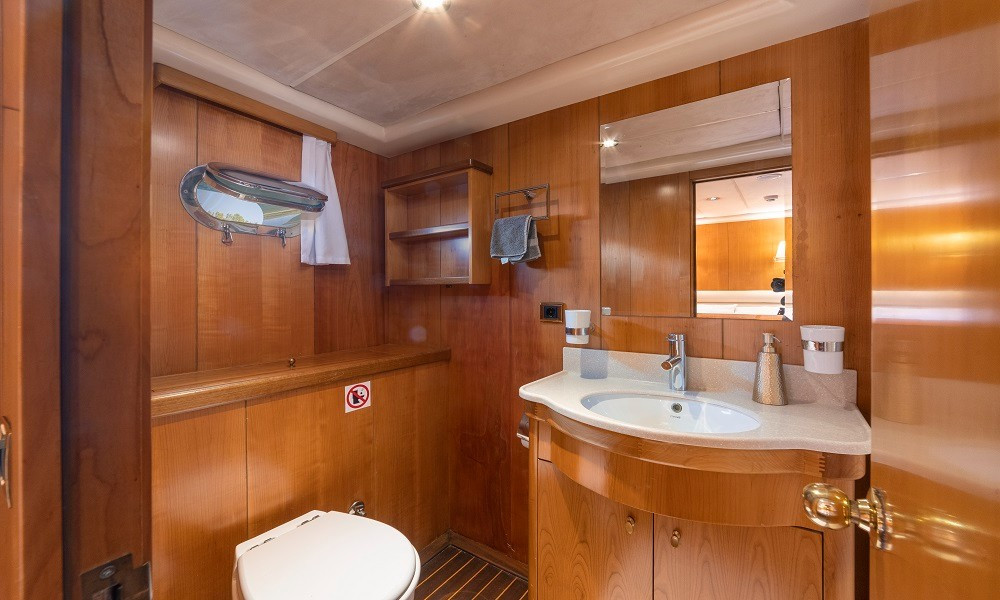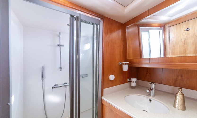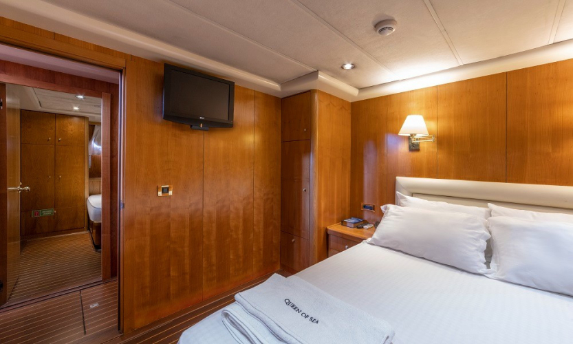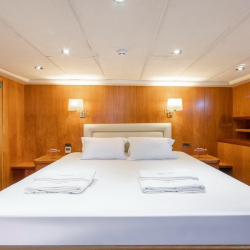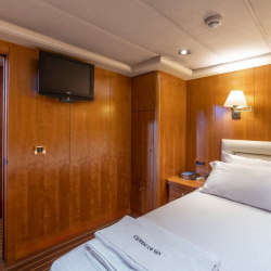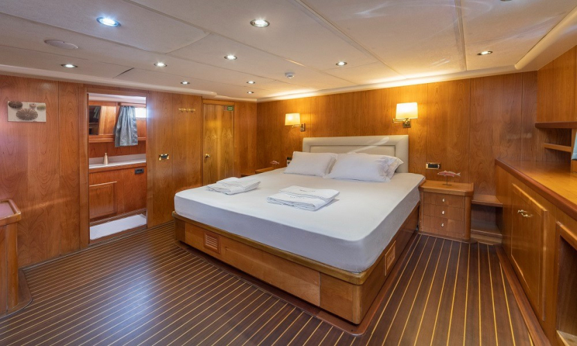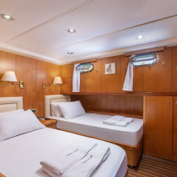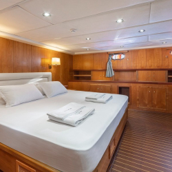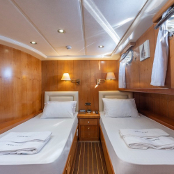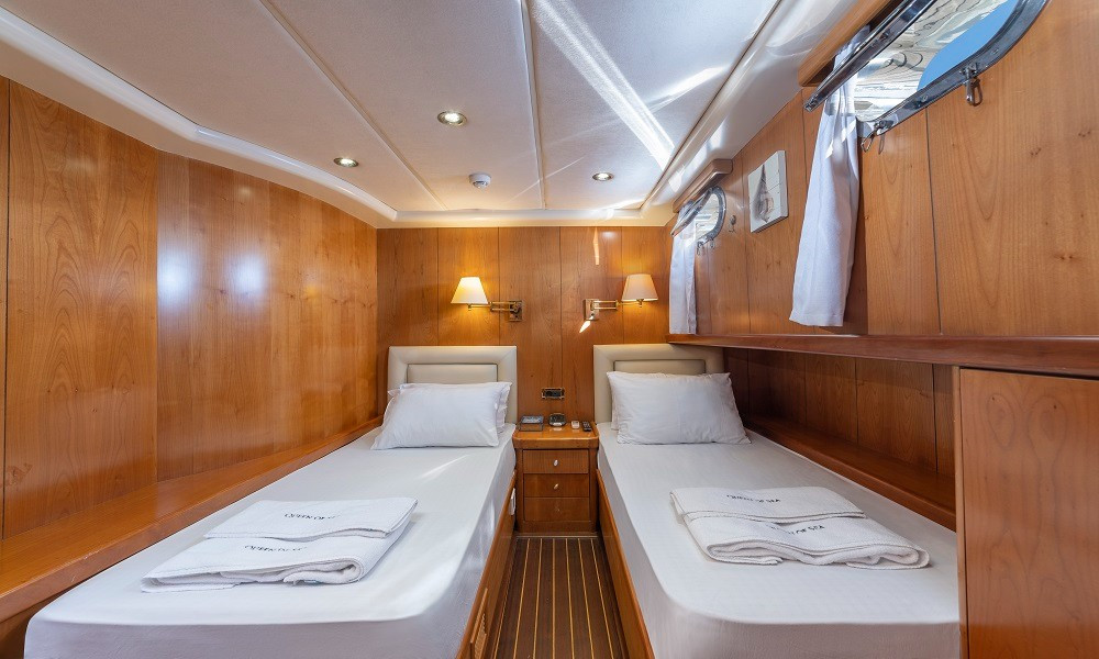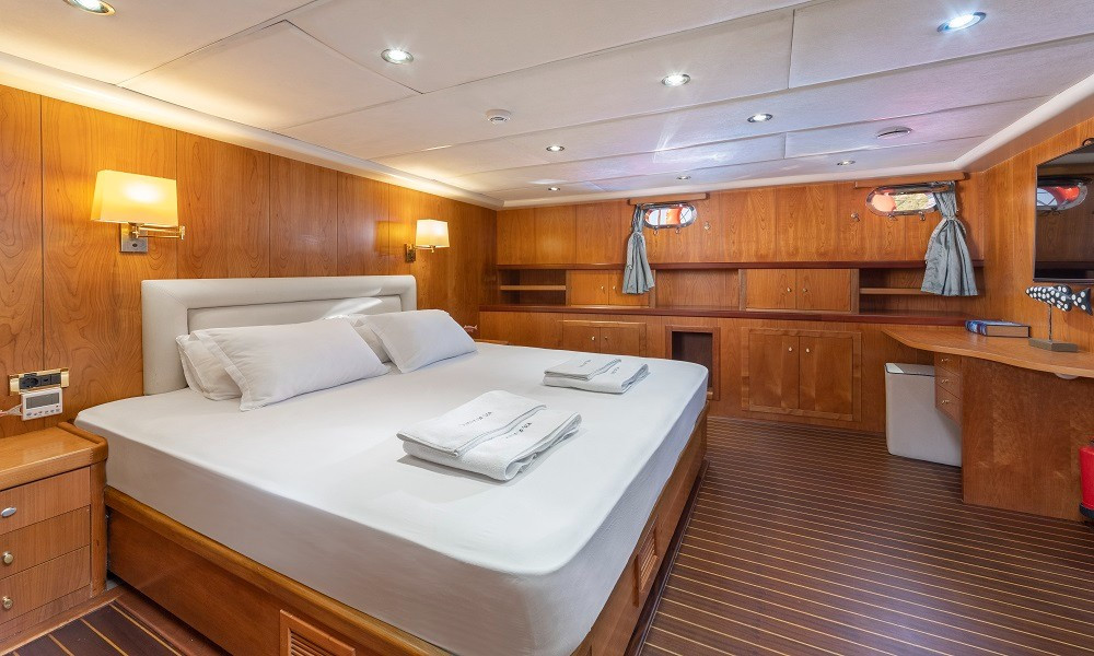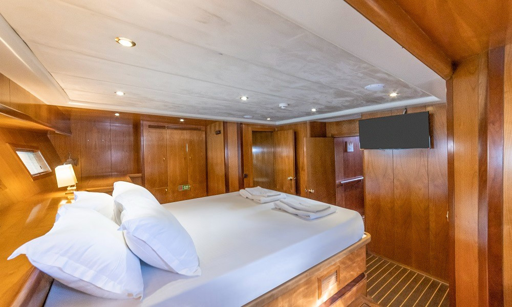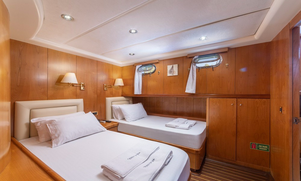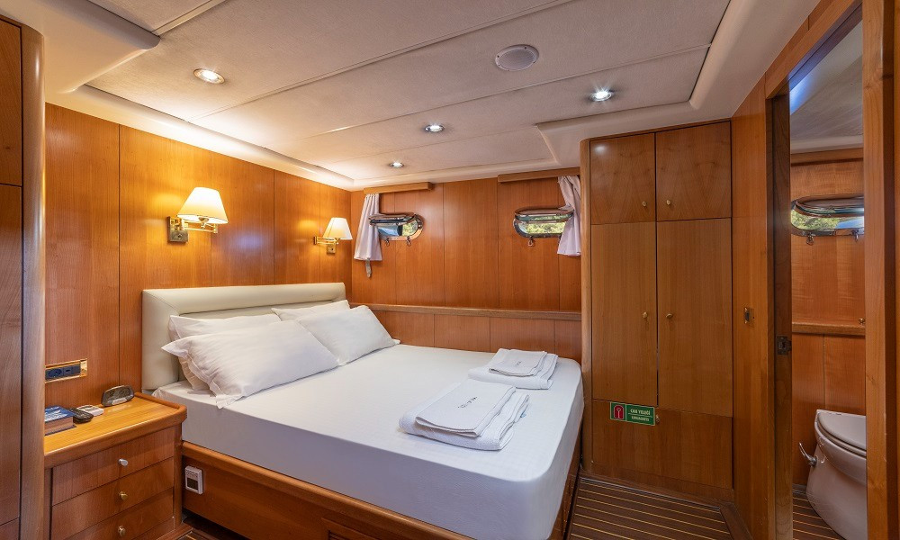 5 Kabin: 2 Master, 2 Double, 1 Twin kabin. Tüm kabinlerde klima, TV, müzik sistemi, kasa, özel duşlu banyo, ev tipi WC, havlular ve saç kurutma makinesi bulunur.