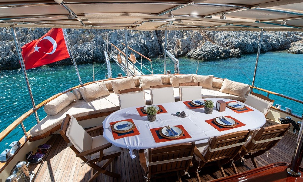 Siz hiç bir şeye karışmadan tatiliniz boyunca size tam pansiyon konaklama sunabiliriz. Bu durumda Standart, Lüks ya da Delüks menülerimizden birini tercih ederek kişi başı günlük 45 ile 65 Euro arasında değişen bir bedel ödeyerek alkollü içecekler hariç herşey dahil tatilinizi yapabilirsiniz. Alkollü içeceklerinizi dilediğiniz şekilde temin edip tekneye getirebilirsiniz.