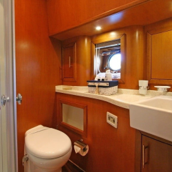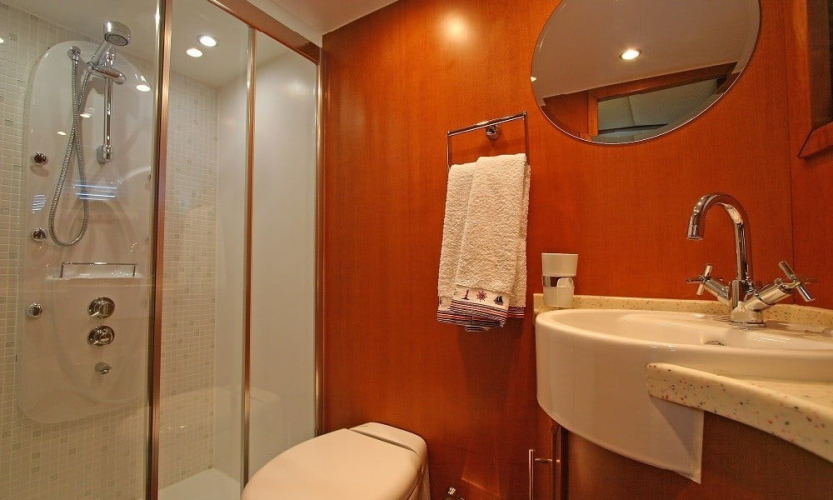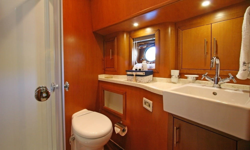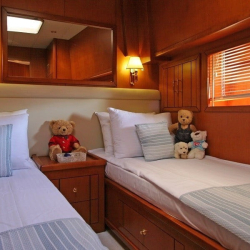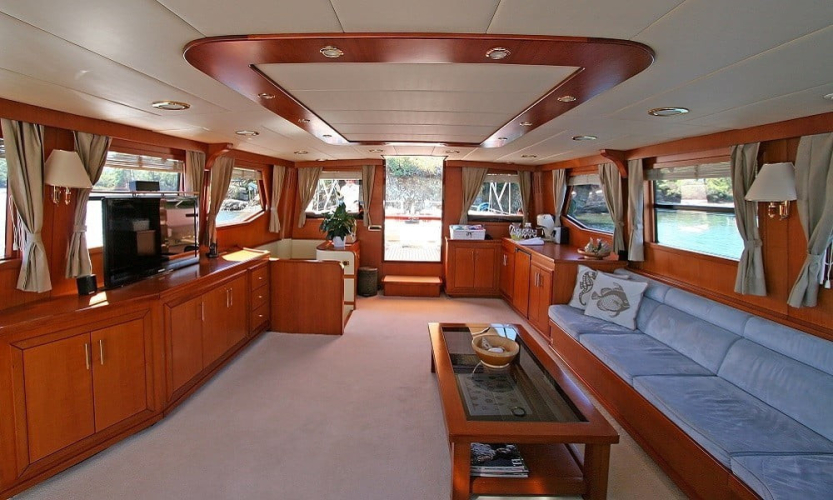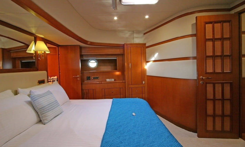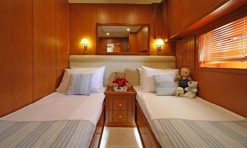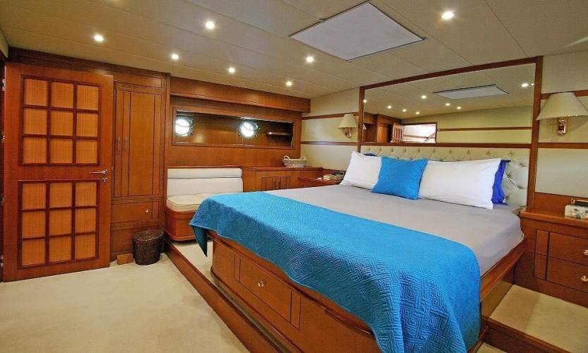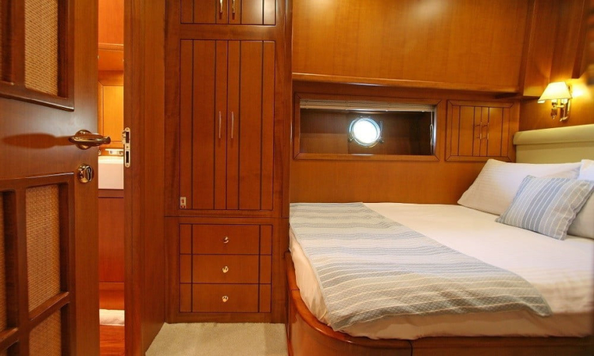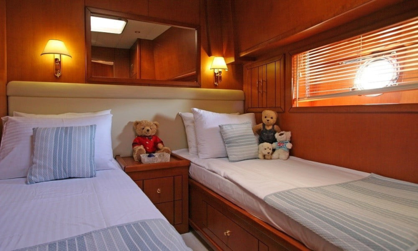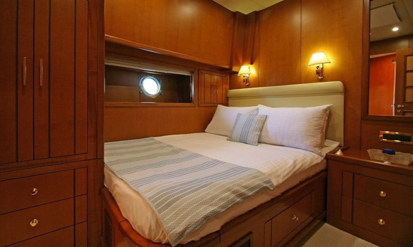 Teknede 2 master, 1 double ve 1 twin kabin bulunur. Her kabin; klima, duşakabinli banyo, WC, banyo ve el havluları ile saç kurutma makinesi gibi ihtiyaçlarınıza yönelik donanımlarla donatılmıştır. Salonda oturma grubu, TV, bar ve müzik sistemi yer alır.