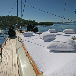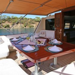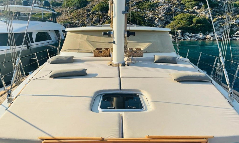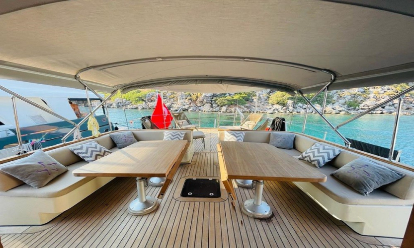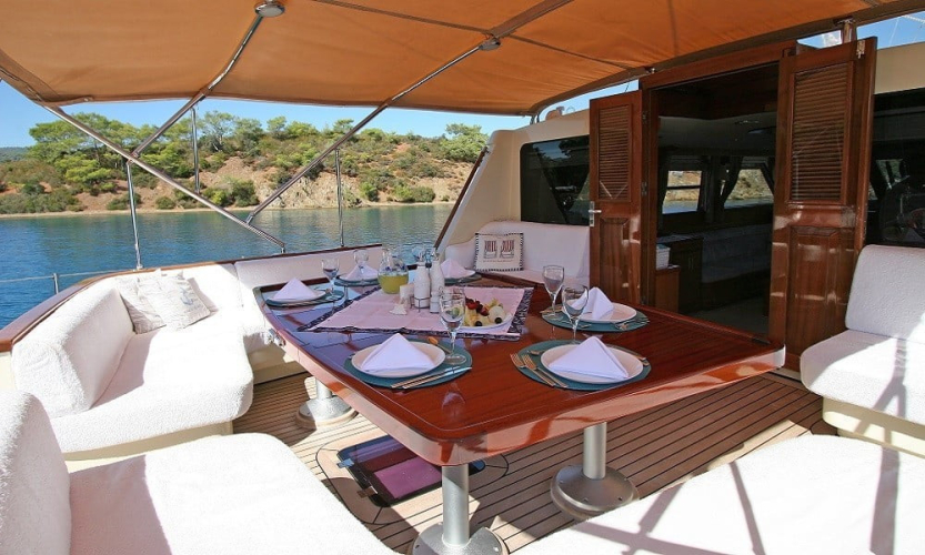 Tik ağacı kaplı güvertede arka kısımda oturma grubu, yemek masası, TV, müzik sistemi ve bar bulunur. Ön güvertede ise geniş güneşlenme alanları ve oturma grubu yer alır. Deniz merdiveni ve güverte duşu da mevcuttur.