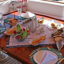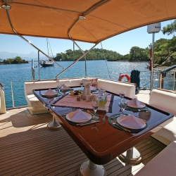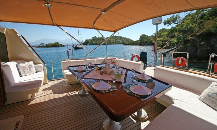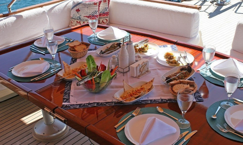 Siz hiç bir şeye karışmadan tatiliniz boyunca size tam pansiyon konaklama sunabiliriz. Bu durumda Standart, Lüks ya da Delüks menülerimizden birini tercih ederek kişi başı günlük 45 ile 65 Euro arasında değişen bir bedel ödeyerek alkollü içecekler hariç herşey dahil tatilinizi yapabilirsiniz. Alkollü içeceklerinizi dilediğiniz şekilde temin edip tekneye getirebilirsiniz.